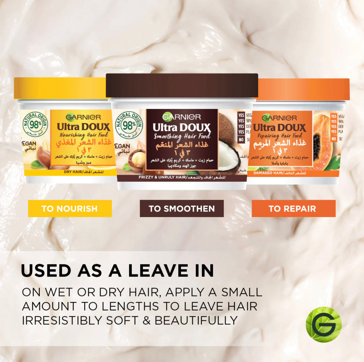 Garnier Ultra Doux Vegan Hair Food, our new way to nourish hungry hair. With 98% Natural Origin and 100% Vegan Blends, it is enriched with Super Food Extracts for Super Hair. This Ultimate blend of Smoothing Coconut & Macadamia is a nourishing 3-in-1 hair mask treatment for Frizzy and Unruly Hair. 3 ways to enjoy Coconut Hair Food; as a Hot Oil Bath, as a Mask or as a leave in Cream.