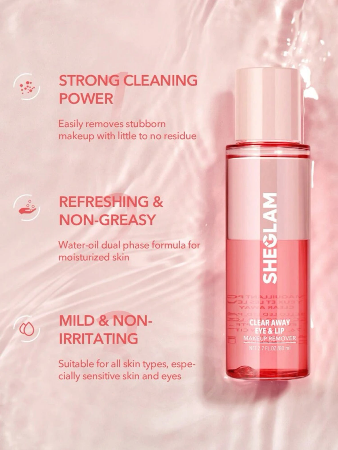 Waterproof makeup has finally met its match! This unique makeup remover was specifically designed to tackle waterproof eye makeup and melt it right off after a long day of glam. Featuring a non-greasy and lightweight texture, our SHEGLAM Clear Away Eye & Lip Makeup Remover is suitable for all skin types and all glam types, whether you've put on a full beat or it is a no-makeup-makeup kind of day.