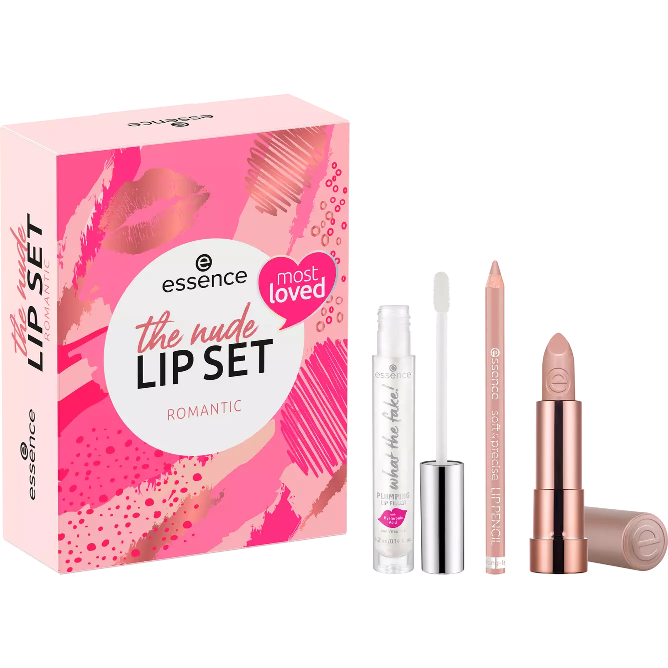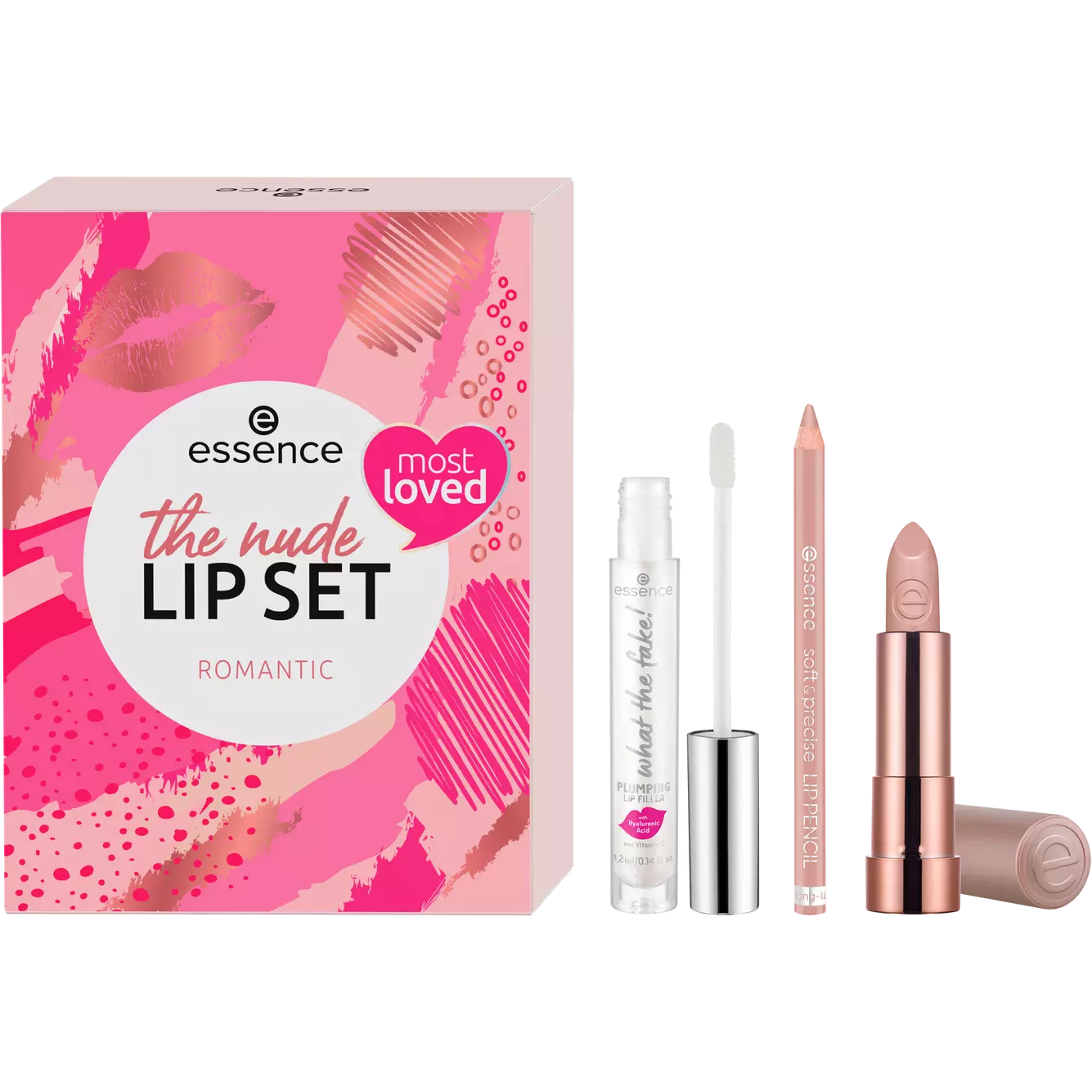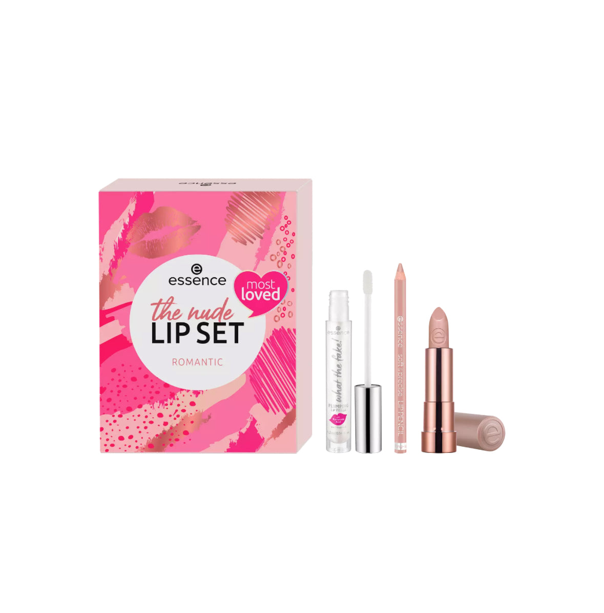 The three products in the essence the nude lip set romantic create gorgeous lip looks: a hydrating lipstick in an elegant nude shade ensures natural results. The Lip Pencil in a soft shade outlines the lips perfectly and precisely, and the what the fake! Plump Lip Filler creates a voluminous, shiny finish.