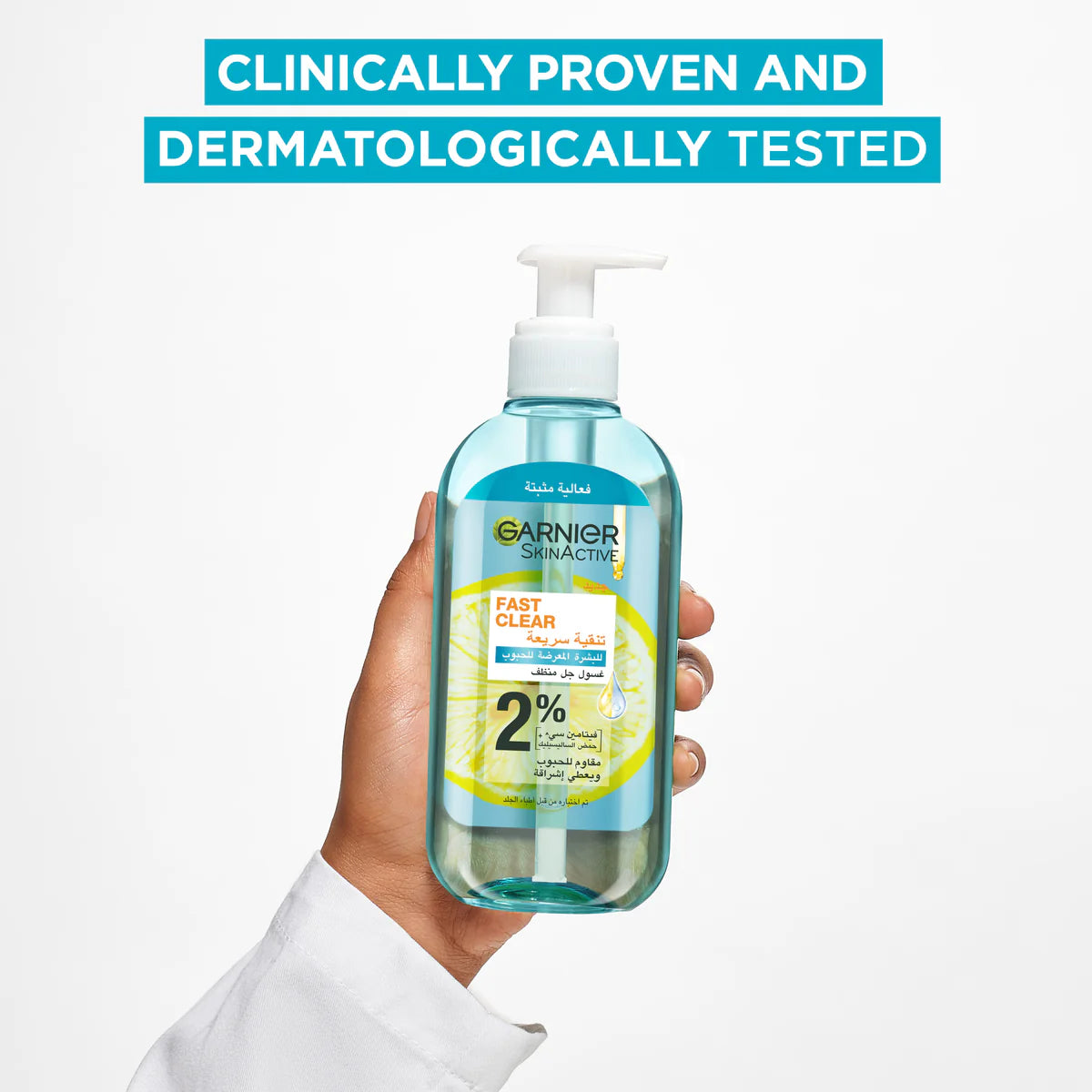 Garnier's Fast Clear Gel Wash forms the new generation of purifying gel wash, enriched with a combination of [2%] Salicylic Acid known to visibly reduce pimples and Vitamin C, a powerful antioxidant known to visibly reduce dark spots and brighten the skin.