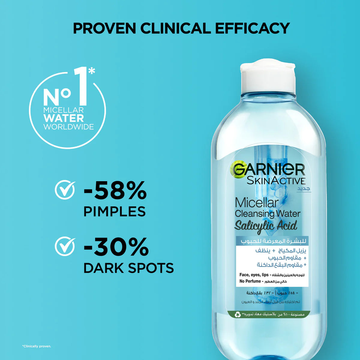 For the first time, Garnier combines its Micellar Technology with Salicylic Acid, known to visibly reduce pimples, and Vitamin C for visibly reducing dark spots.