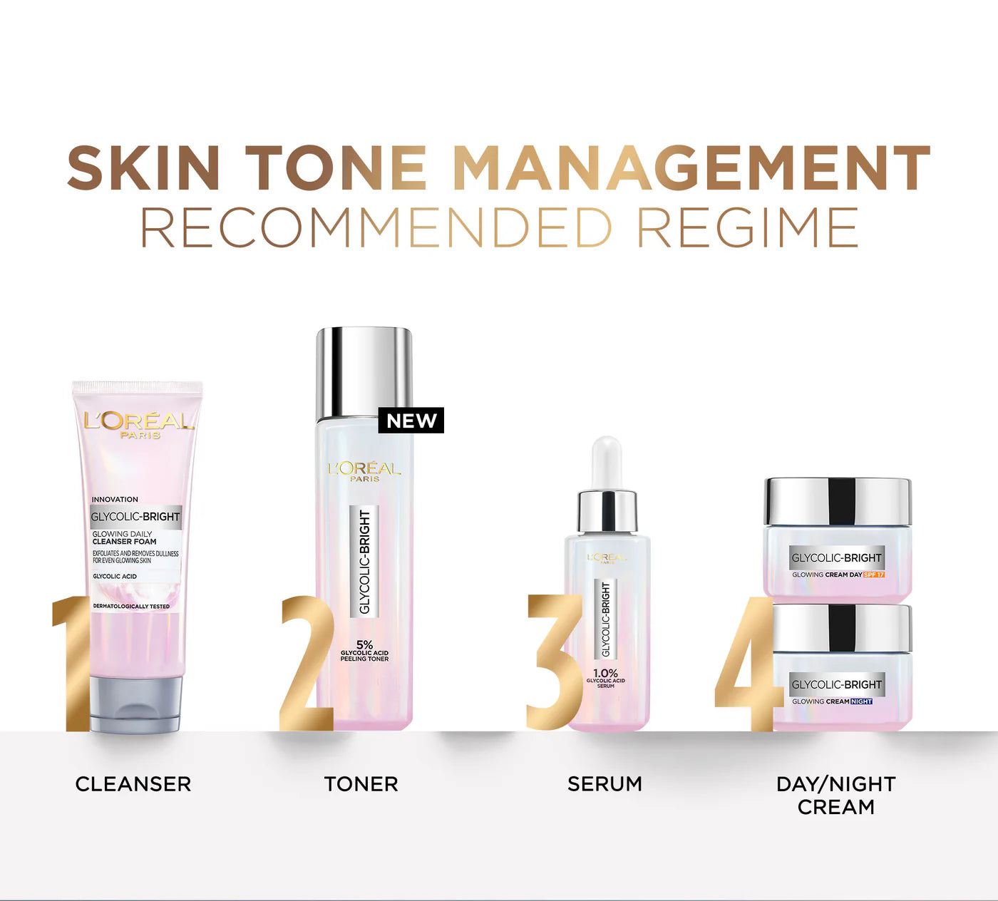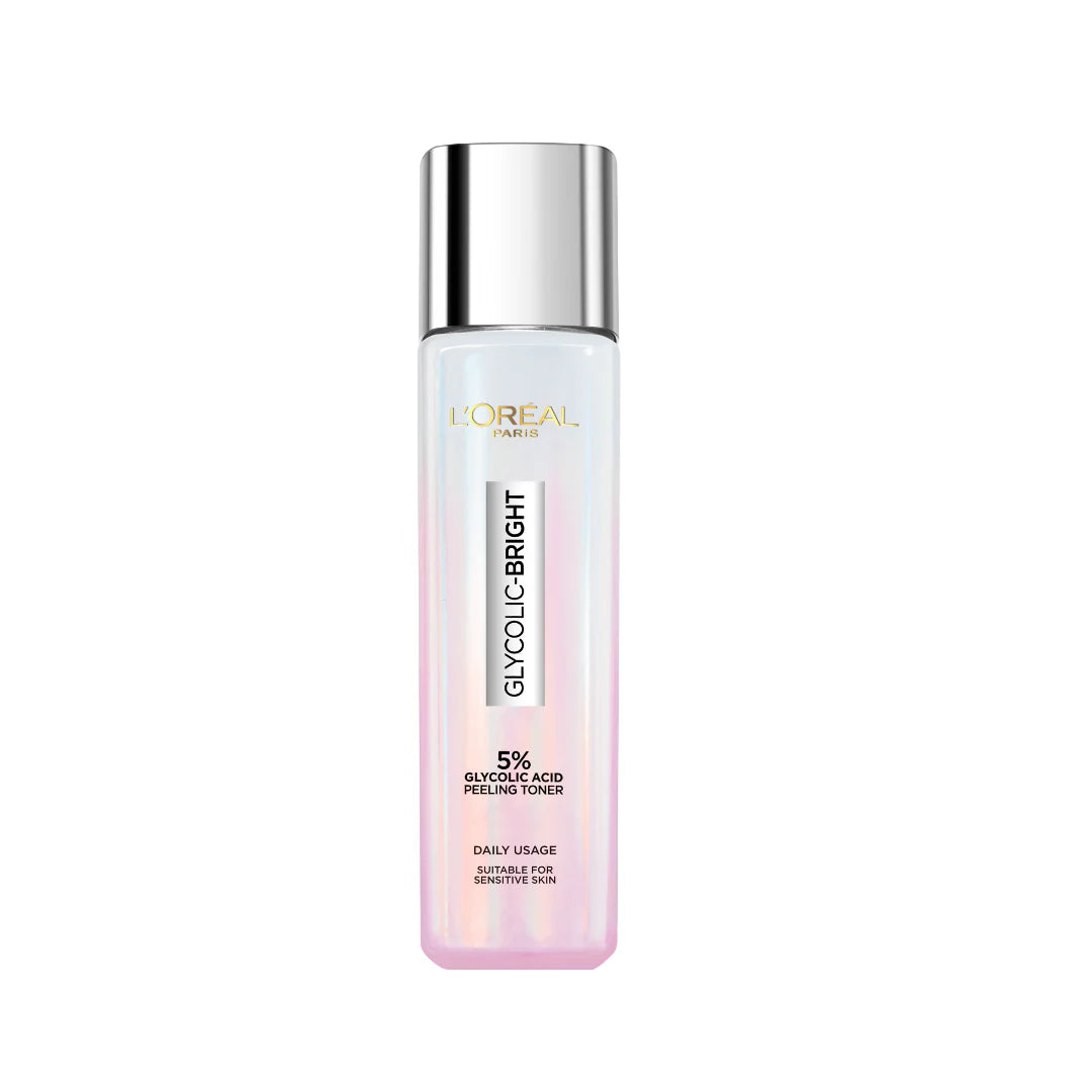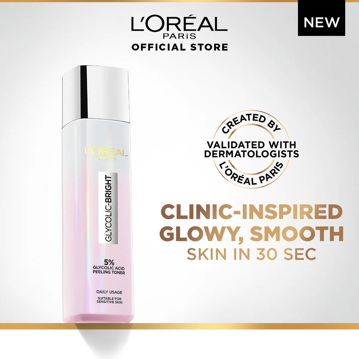 LL’Oréal Skincare Laboratories developed Glycolic-Bright Glowing Peeling Toner formulated with 5% Glycolic Acid, the dermatologist's gold standard for professional peels, formulated for optimal efficiency and safety every day.