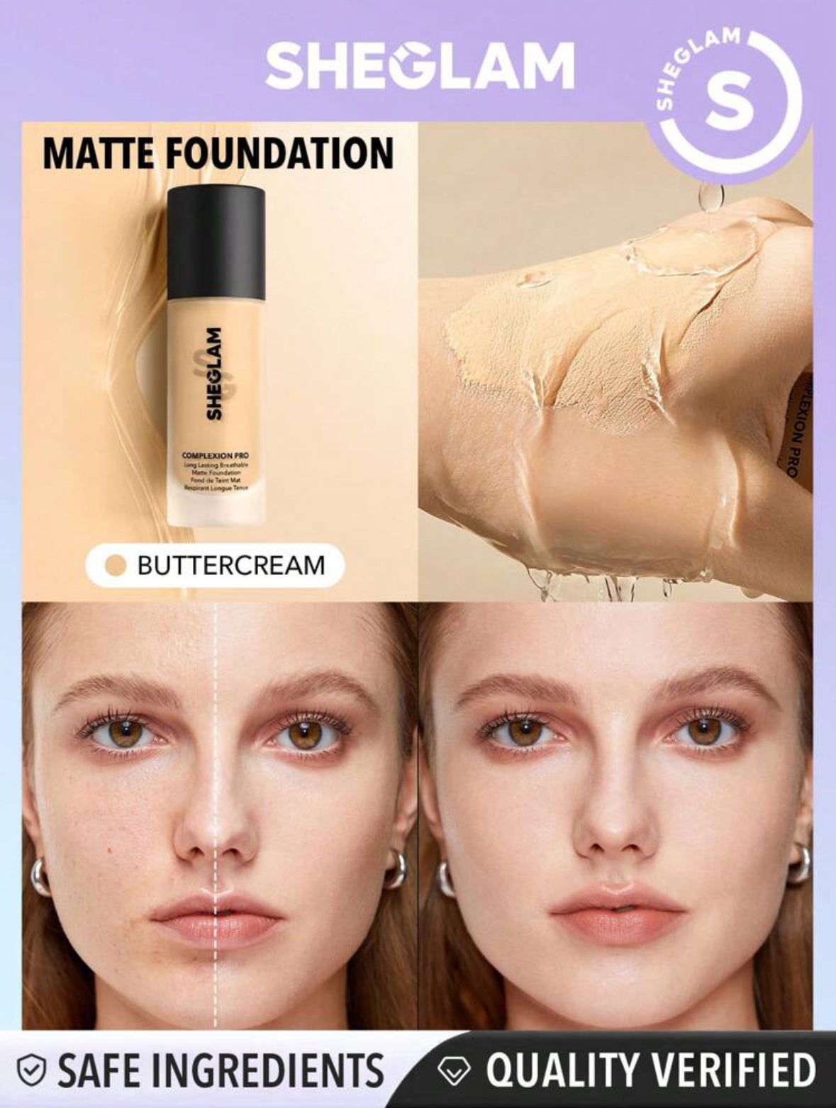 Meet the SHEGLAM COMPLEXION PRO Long-Lasting Breathable Matte Foundation! This next-level sweat- and waterproof formula is free of fragrances and packed with non pore-clogging ingredients, while also remaining breathable and lightweight on the skin. Each face-loving shade delivers a semi-matte, filter-like finish for a look that's flawless yet natural every time. Wear this long-wearing, buildable foundation to the gym or for a night out with the girls—it's a complexion-perfecting pro no matter where you go!