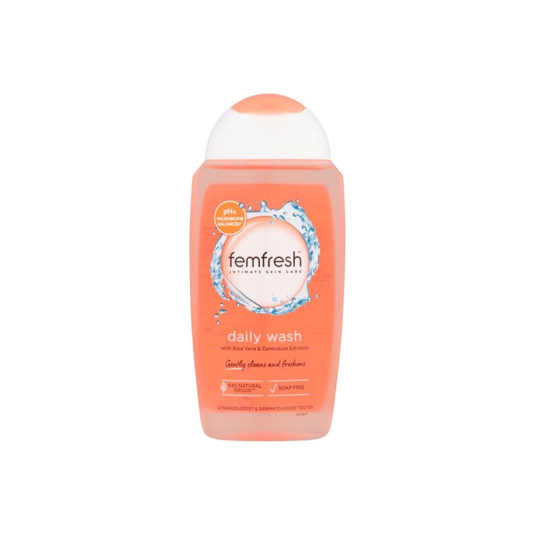 - Femfresh™ daily wash for everyday use contains aloe vera and calendula extracts. Gently cleans your intimate area and leaves you feeling fresh and confident. Suitable for use during your period. Clinically tested under dermatological & gynaecological control.