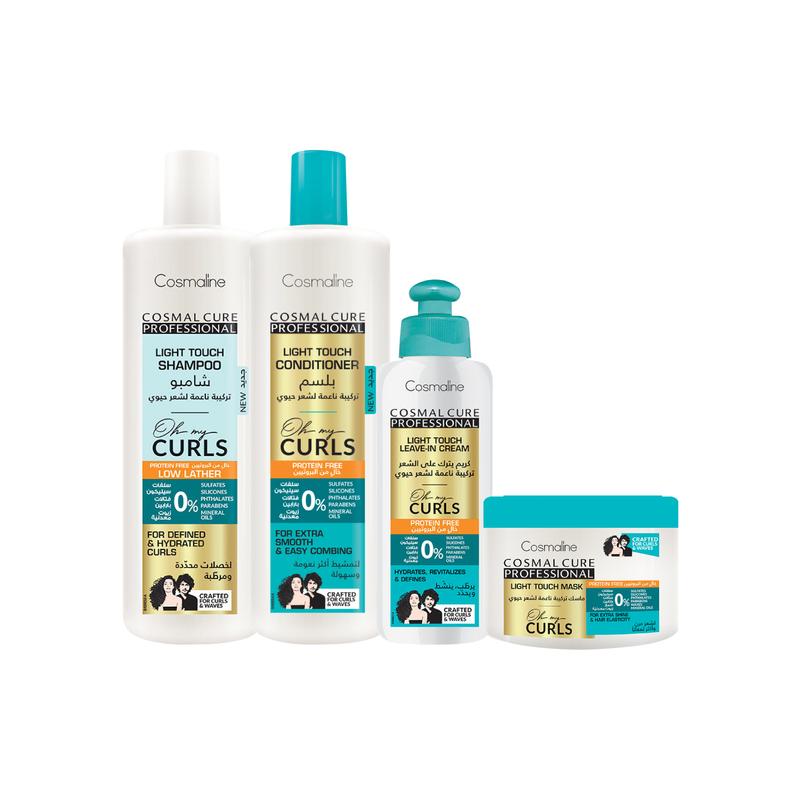 Experience the rejuvenating touch of Cosmal Cure Professional Oh My Curls Light Touch, specially formulated to refresh your scalp and hydrate your curls. This Protein-Free Set defines curly and wavy hair, providing weightless and refreshing moisture. No Sulfates, No Silicones, No Phthalates, No Parabens, No Mineral Oils This Set Contains: Light Touch Shampoo 500ml Light Touch Conditioner 500ml Light Touch Mask 450ml Leave-In Cream 250ml