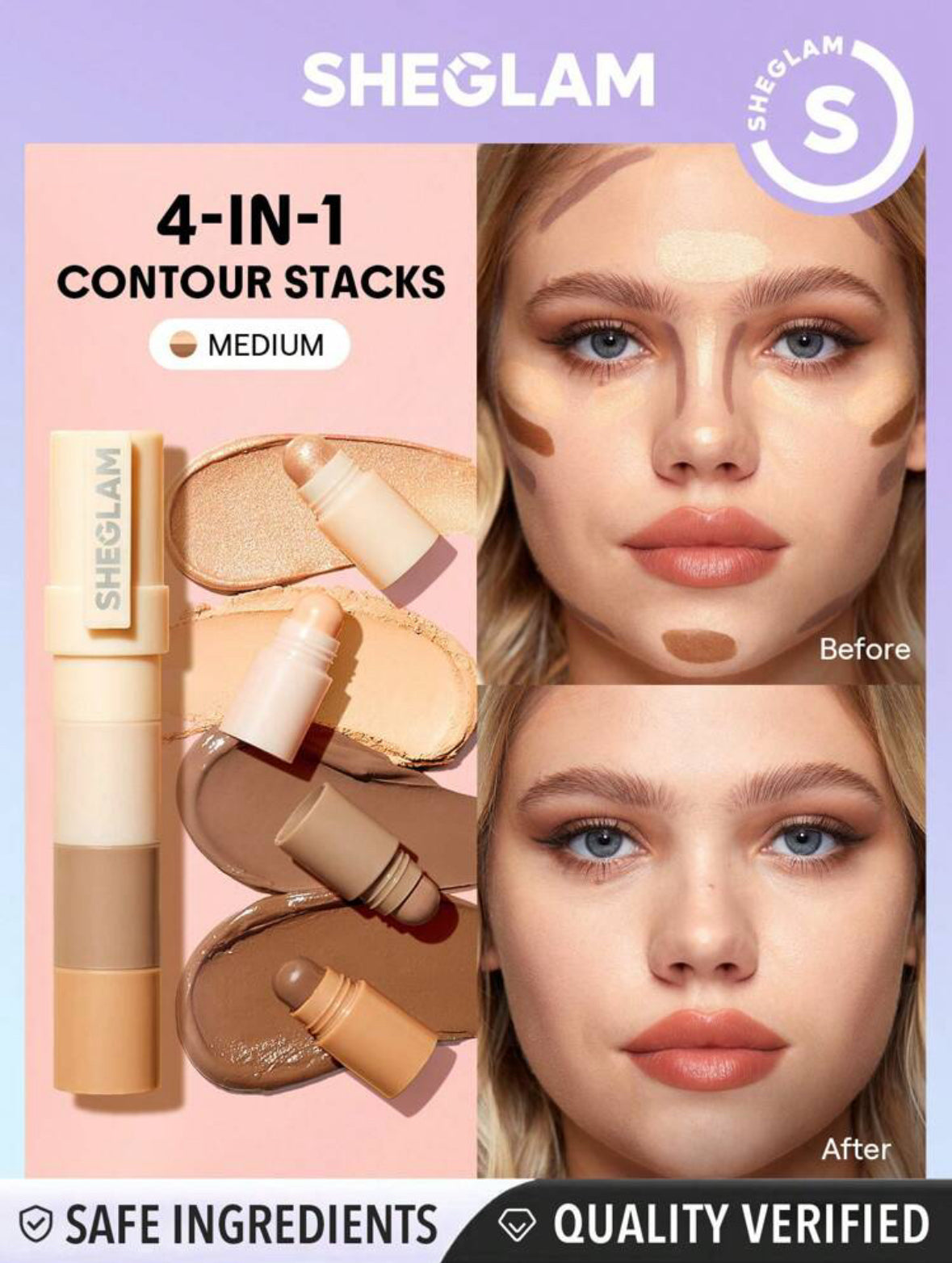 The SHEGLAM Multi-Glam Face Pen is your ultimate 4-in-1 beauty tool, featuring a shimmer highlight, matte highlight, contour, and bronzer-all in one sleek, pen-shaped design. Its smooth texture glides effortlessly onto the skin, making it easy to blend for a natural, sculpted look. Whether you're highlighting, contouring, or bronzing, this multitasking pen simplifies your routine and perfectly defines your face with just a few swipes
